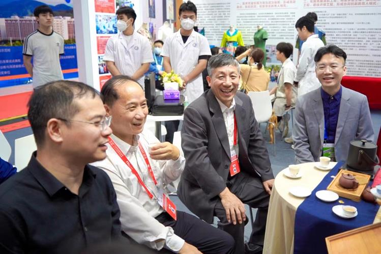 开幕仪式结束后,领导、嘉宾进入展馆,前往各参展企业、学校展位观摩,查看参展品牌、展品,进行深入交流,了解各企业的亮点产品、民办学校高质量发展最新成果。李连宁、赵康一行莅临广东岭南职业技术学院展位参观指导,现场观摩茶艺表演、欣赏服装设计、中医理疗项目,详细了解学校产教融合取得的最新成果,并与现场师生亲切交流,对学校党建工作特色、以大健康为特色的办学理念以及丰富的产教融合成果予以高度评价。