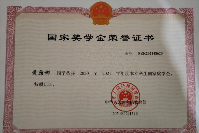 黄露娜同学在校期间,获得过2020-2021学年国家奖学金、2021-2022学年国家奖学金、广东省2022年度励志学生成长成才典型、第十三届“挑战杯”广东大学生创业计划竞赛铜奖、2021年校级“优秀共青团干部”、2022年校级“优秀学生骨干”等18项荣誉称号。