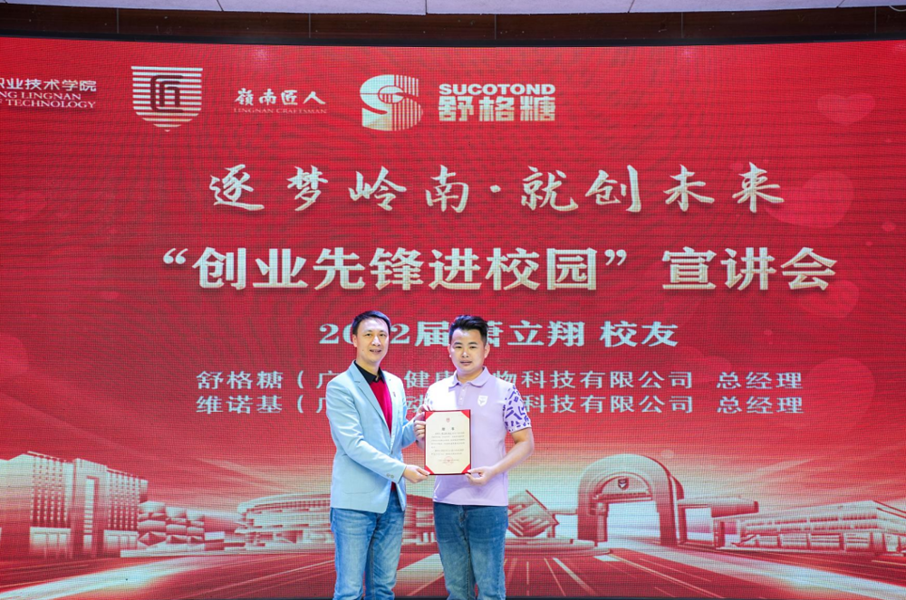 捐赠仪式上,萧立翔校友代表舒格糖(广州)健康生物科技有限公司向学校捐赠“舒格糖立志奖助学金”100万元。李峻代表广东岭南职业技术学院与萧立翔校友签订捐赠协议,并代表学校接受捐赠。
