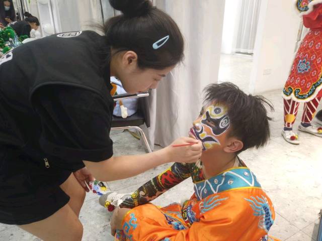 在中场休息的间隙,记者看到大汗淋漓的英歌队成员。“学生们在炎热的气温下画着油彩、穿着厚重的服装进行巡游表演,实属不易,队伍中还有不少女生,他们也跟着男生一起,从来都不喊一声累。”苏娜娜说。